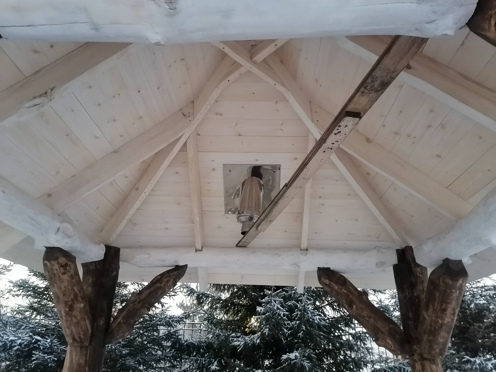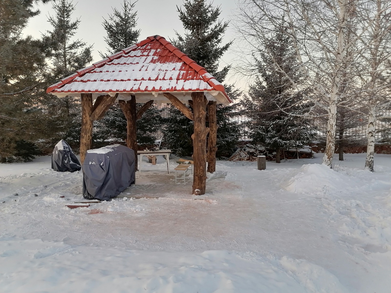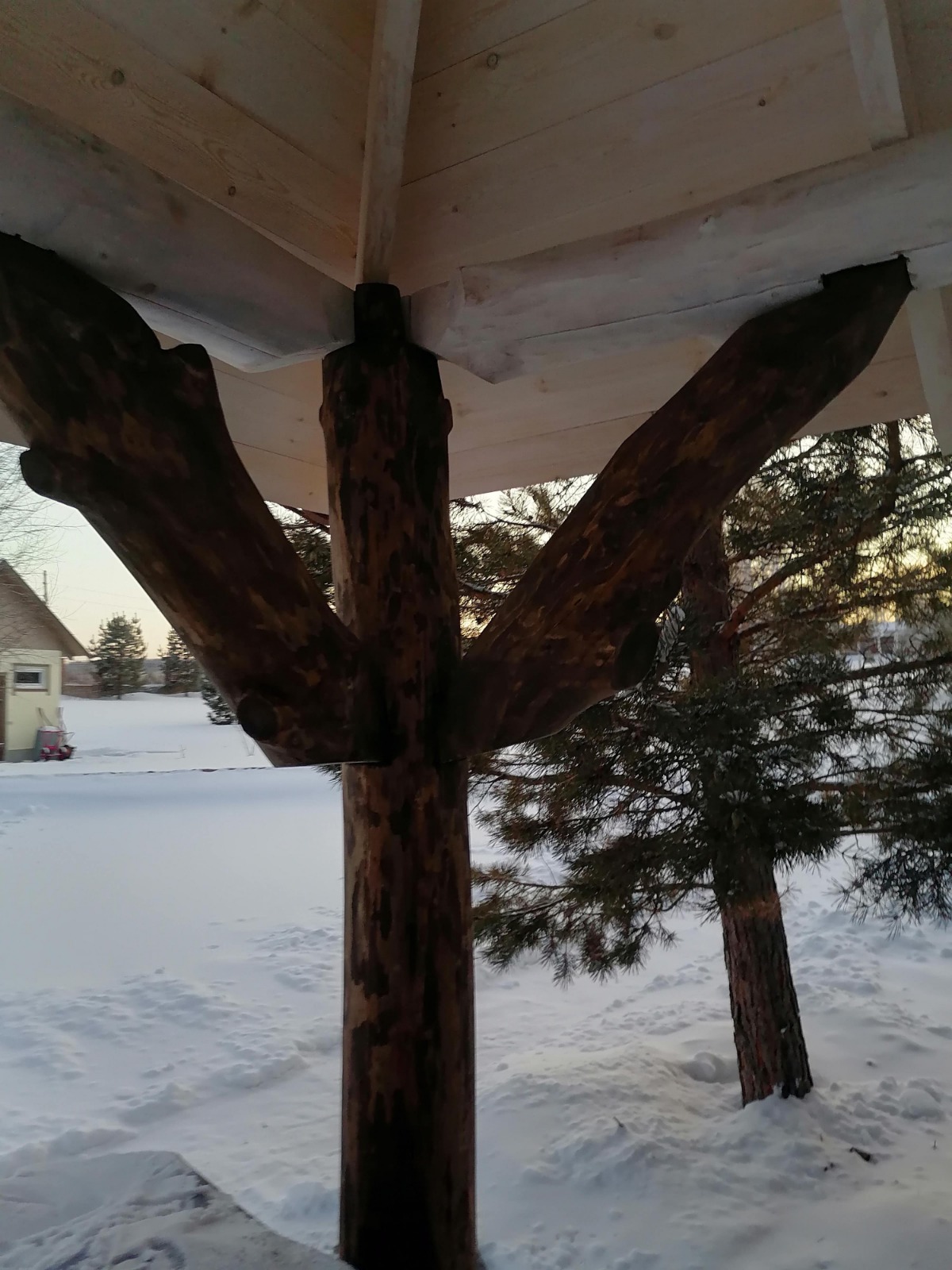 Беседка из неоцилиндрованного бревна на бетонном основании, может быть использована как крытая мангальная зона